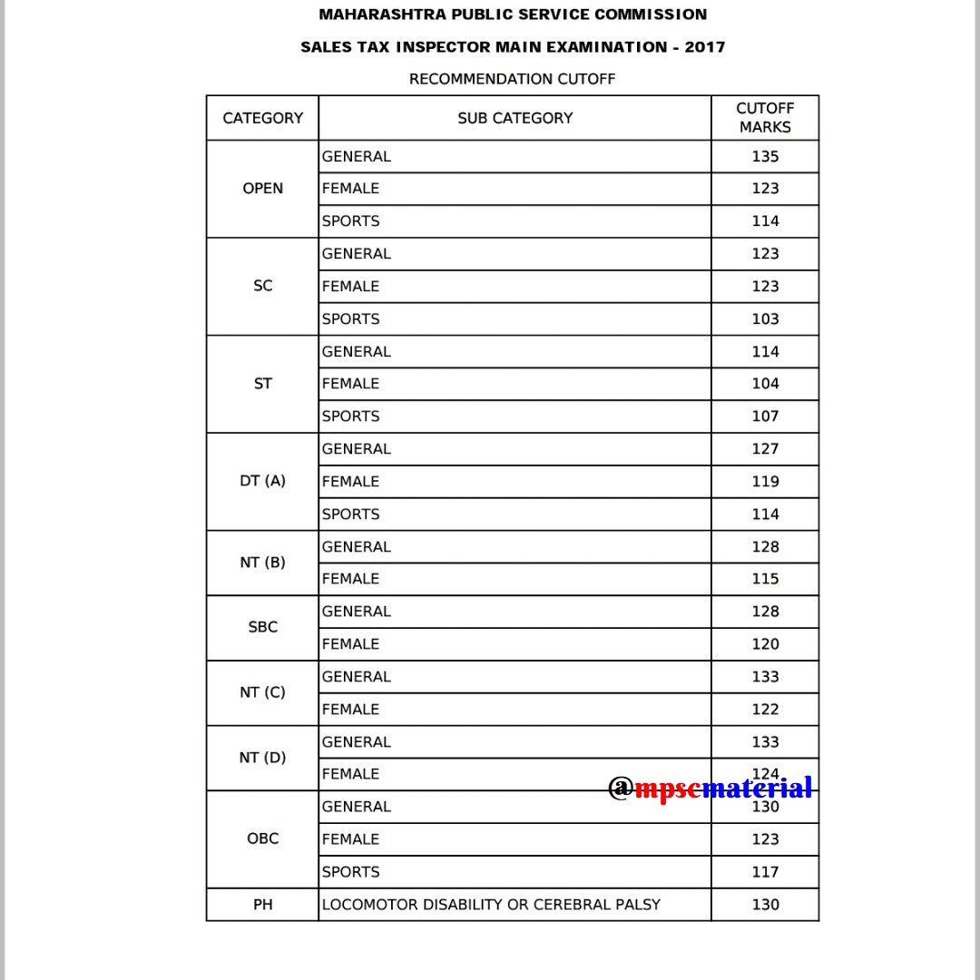 MPSC STI MAIN 2017 Cut Off